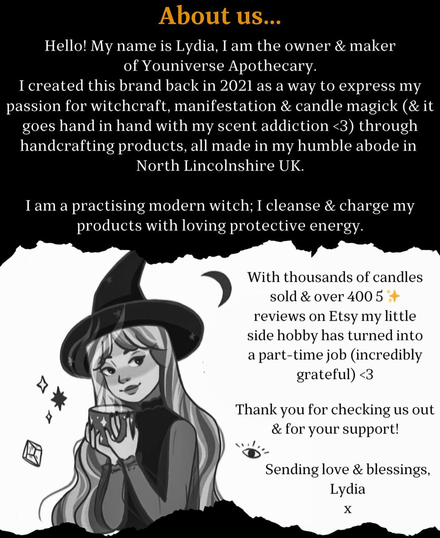 Driven By A Passion For Nature, The Universe, & All Things Mystical & Magickal, Youniverse Apothecary Specialises In Conjuring Up Handmade Products With Intent, All Handcrafted In North Lincolnshire UK.