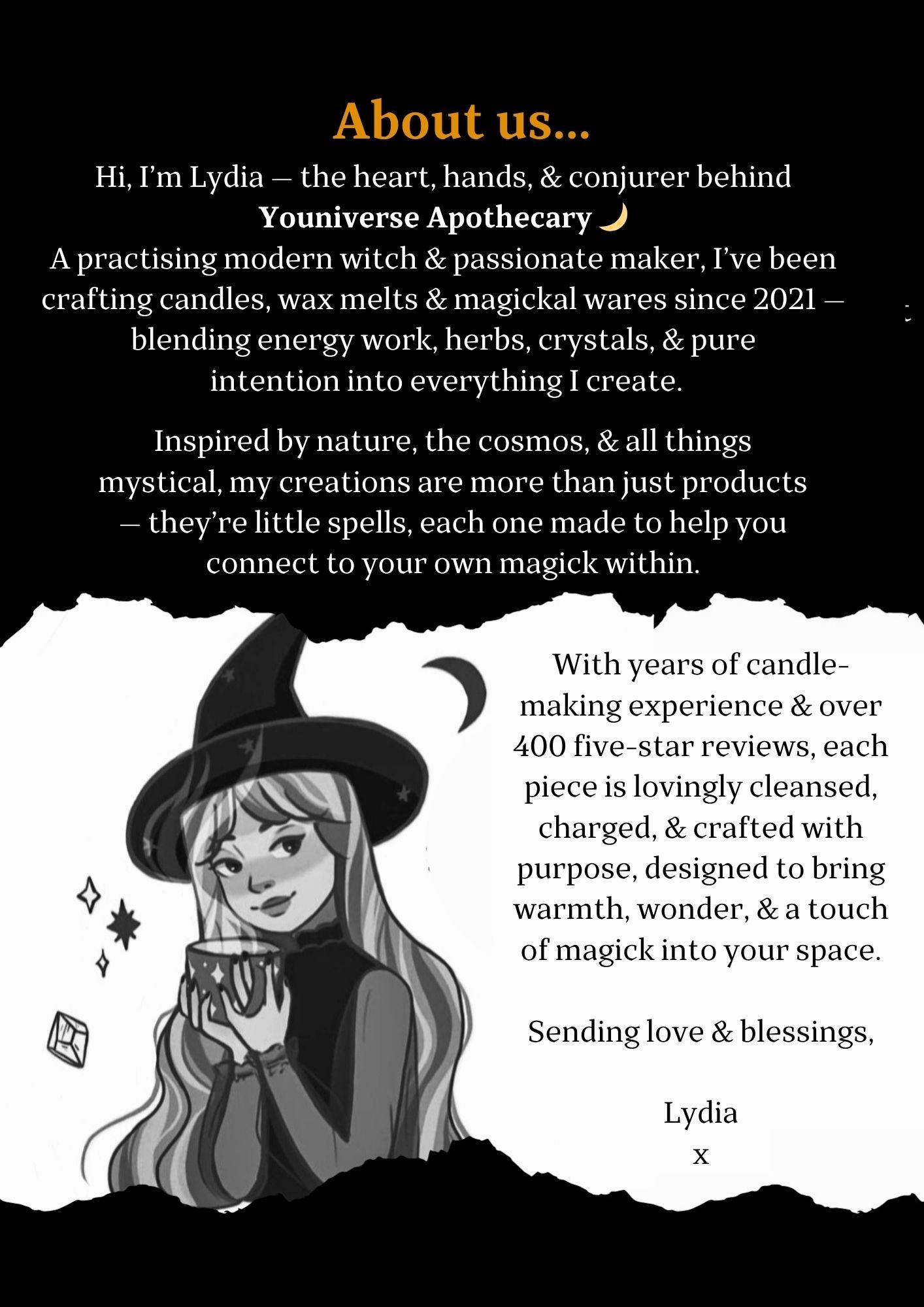 Born from a love of witchcraft, nature, the cosmos, & all things mystical, Youniverse Apothecary is the sacred craft of a practising witch. Every piece is lovingly conjured in North Lincolnshire, UK. Each candle, wax melt, & magickal ware is hand-poured, blessed & enchanted with purpose.