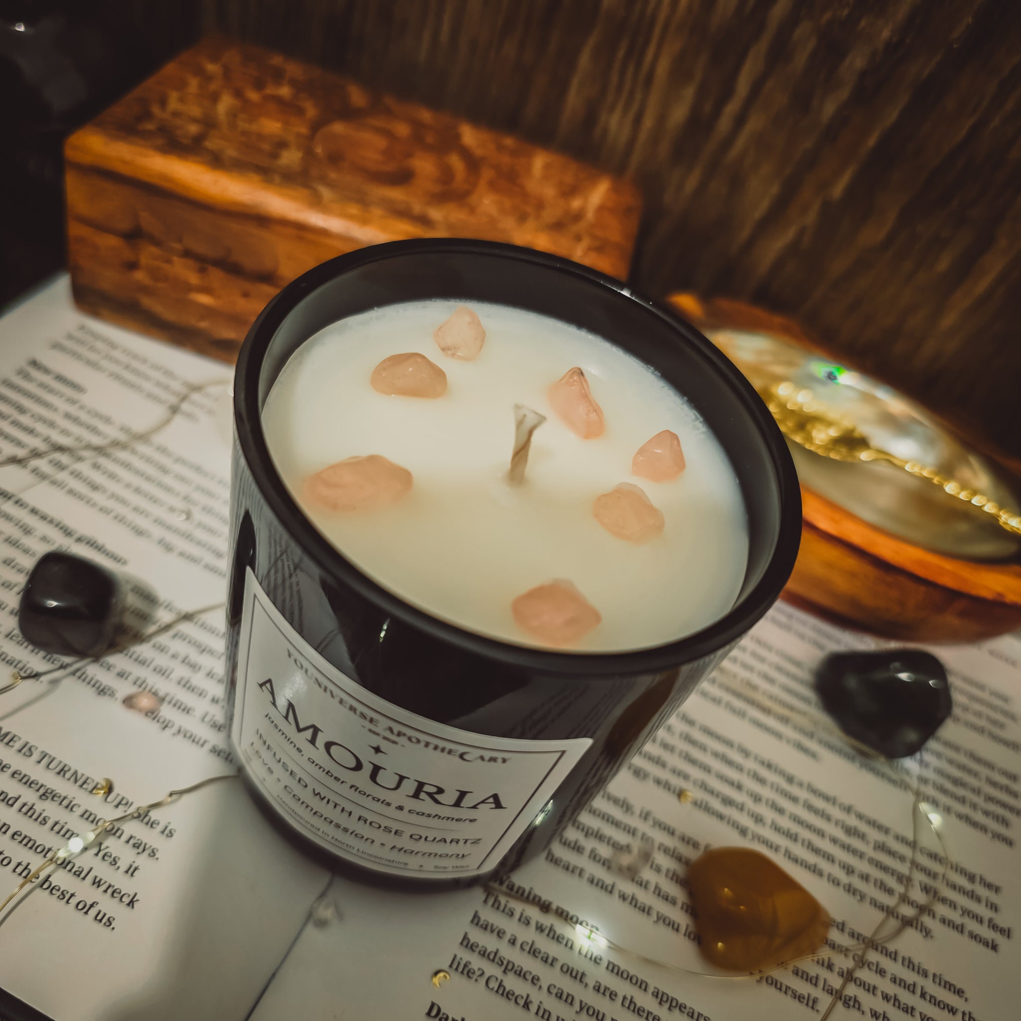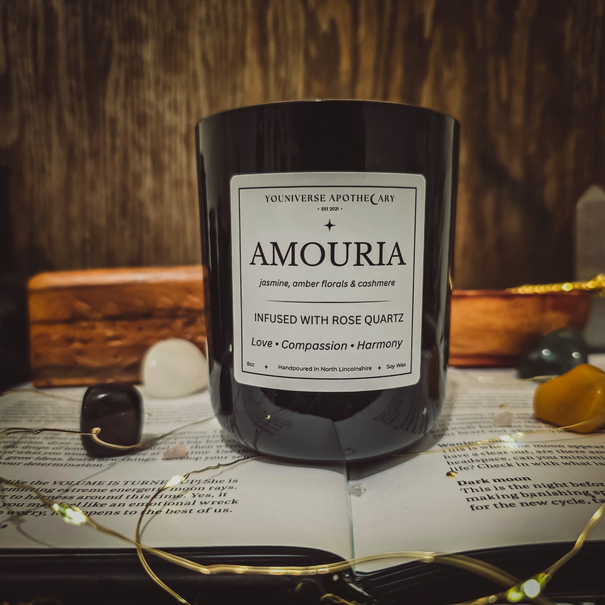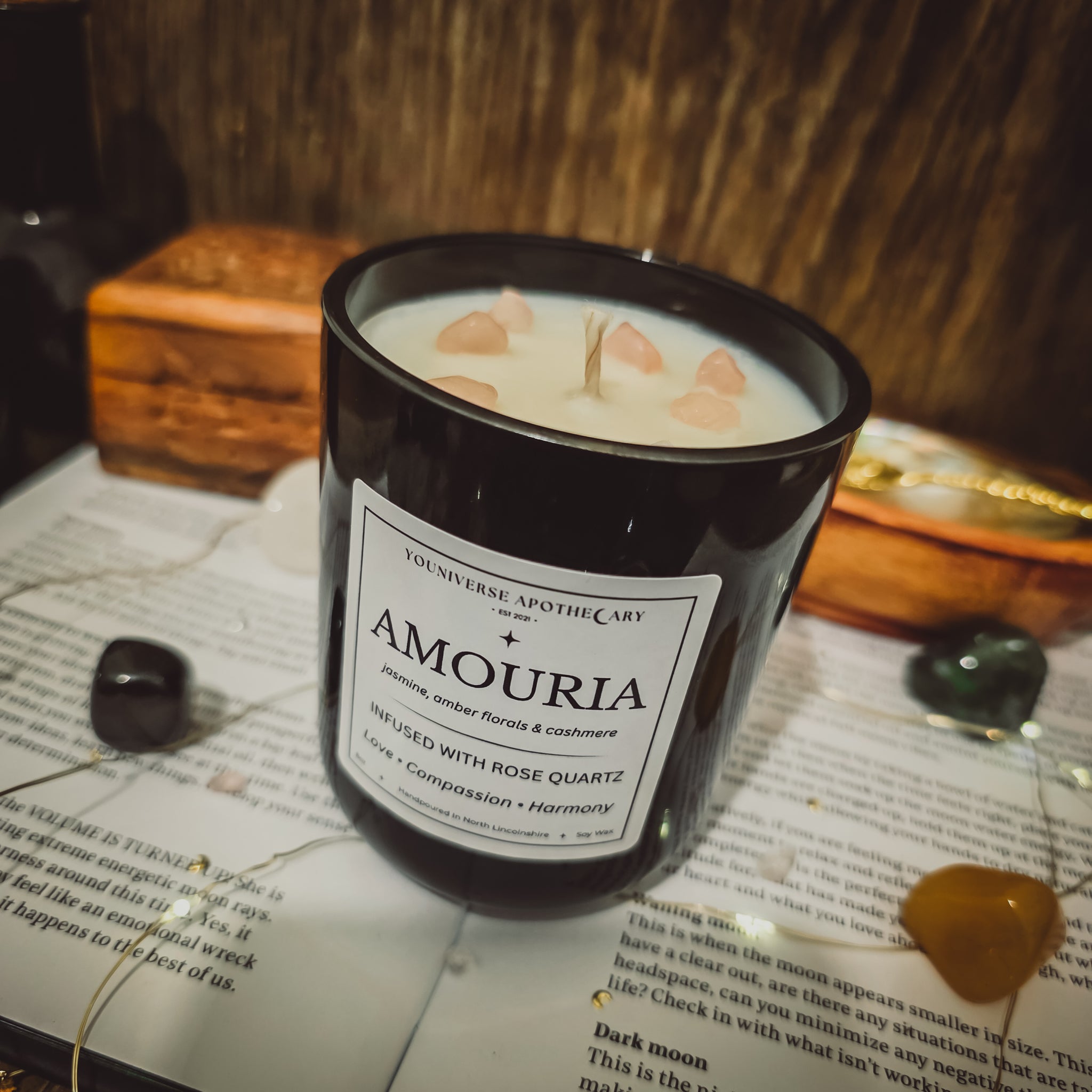 Amouria carries the nurturing frequency of rose quartz - a stone associated with unconditional love, heart opening, & gentle emotional healing. It encourages self-love, affectionate connection, & the release of emotional barriers, allowing the heart to open with trust & ease. Jasmine brings a light romantic glow, while warm amber florals & cashmere create a cocooning sense of comfort, warmth, & safety.