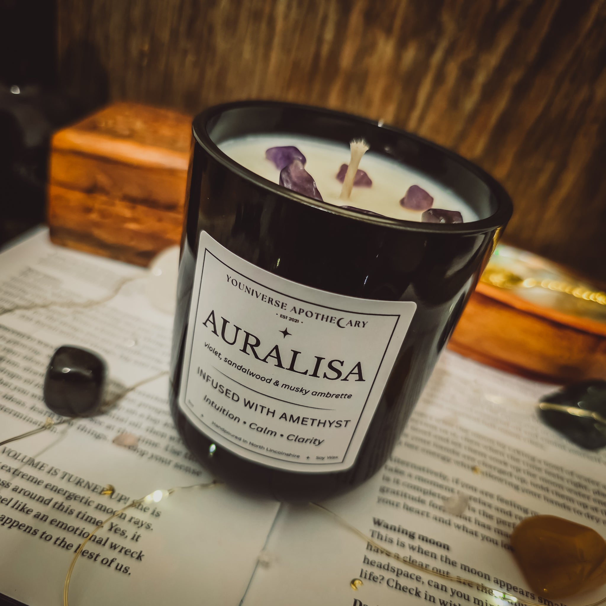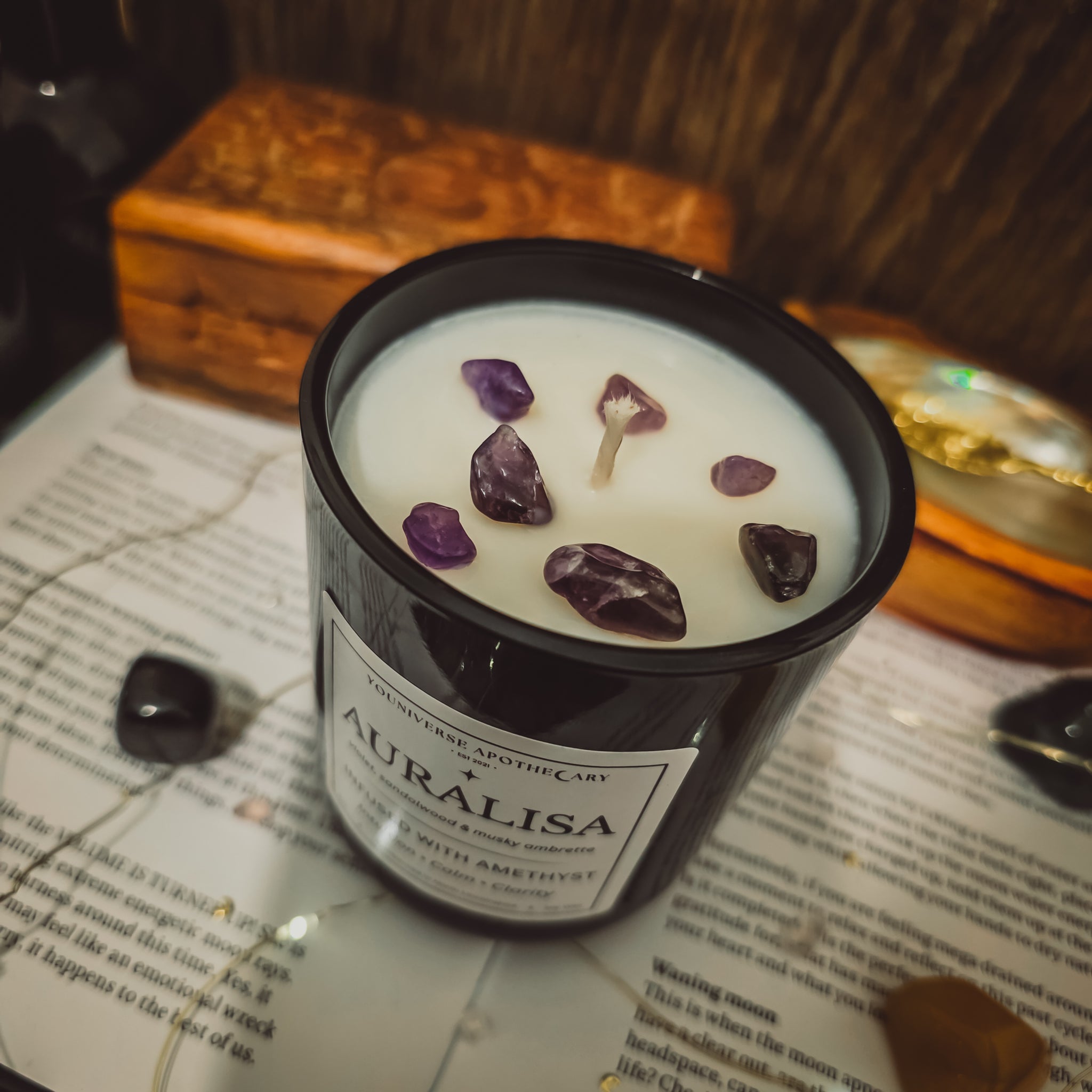 ✦ Warning: It is strongly advised that you remove crystals, dried flowers & anything else that could potentially catch fire before lighting candle. Never leave a lit candle unattended. Keep out of the reach of children & pets. Do not burn for longer than 3 hours at a time & always make sure you are burning on a heatproof, non-flammable surface away from any windows or hazards. Trim wicks to about 4mm before lighting. Always extinguish the candle.