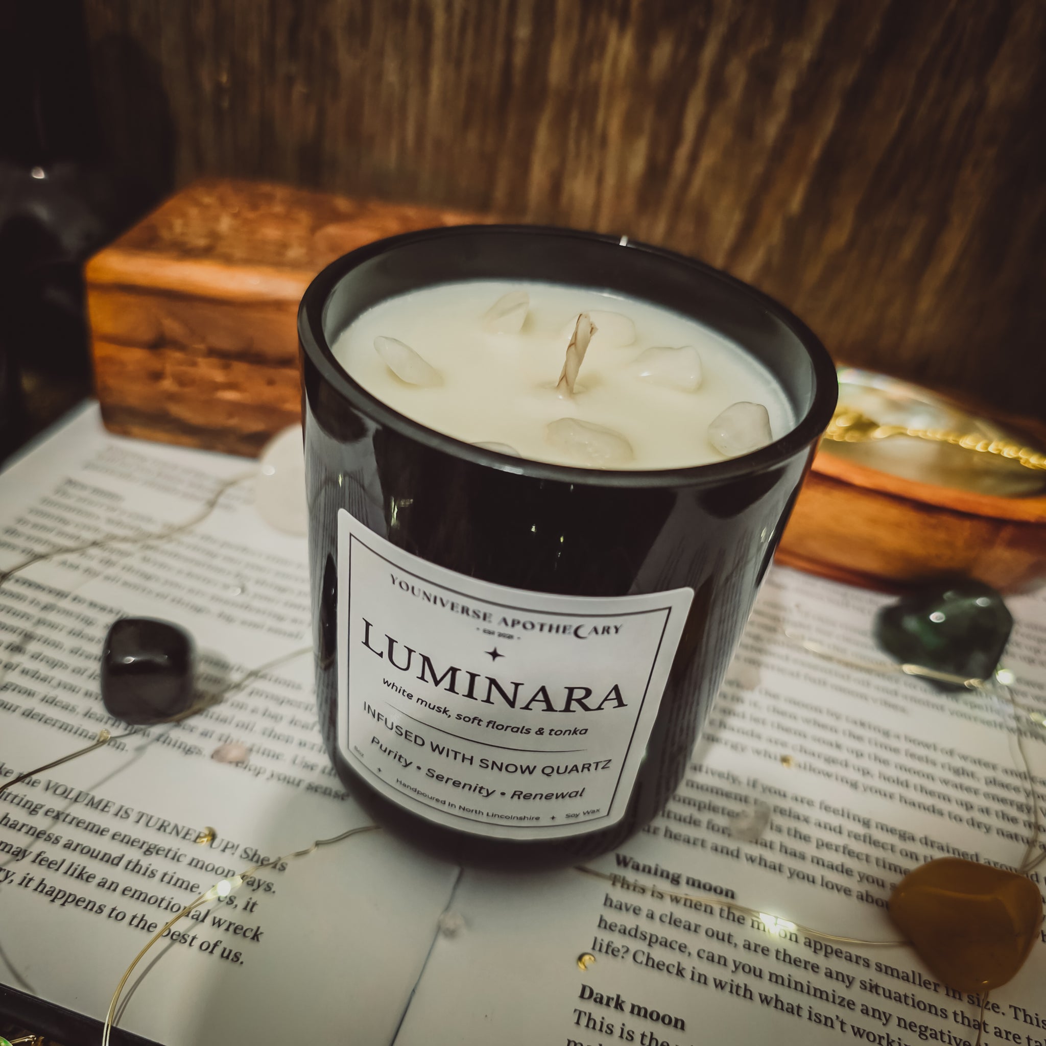 ✦ Warning: It is strongly advised that you remove crystals, dried flowers & anything else that could potentially catch fire before lighting candle. Never leave a lit candle unattended. Keep out of the reach of children & pets. Do not burn for longer than 3 hours at a time & always make sure you are burning on a heatproof, non-flammable surface away from any windows or hazards. Trim wicks to about 4mm before lighting. Always extinguish the candle.