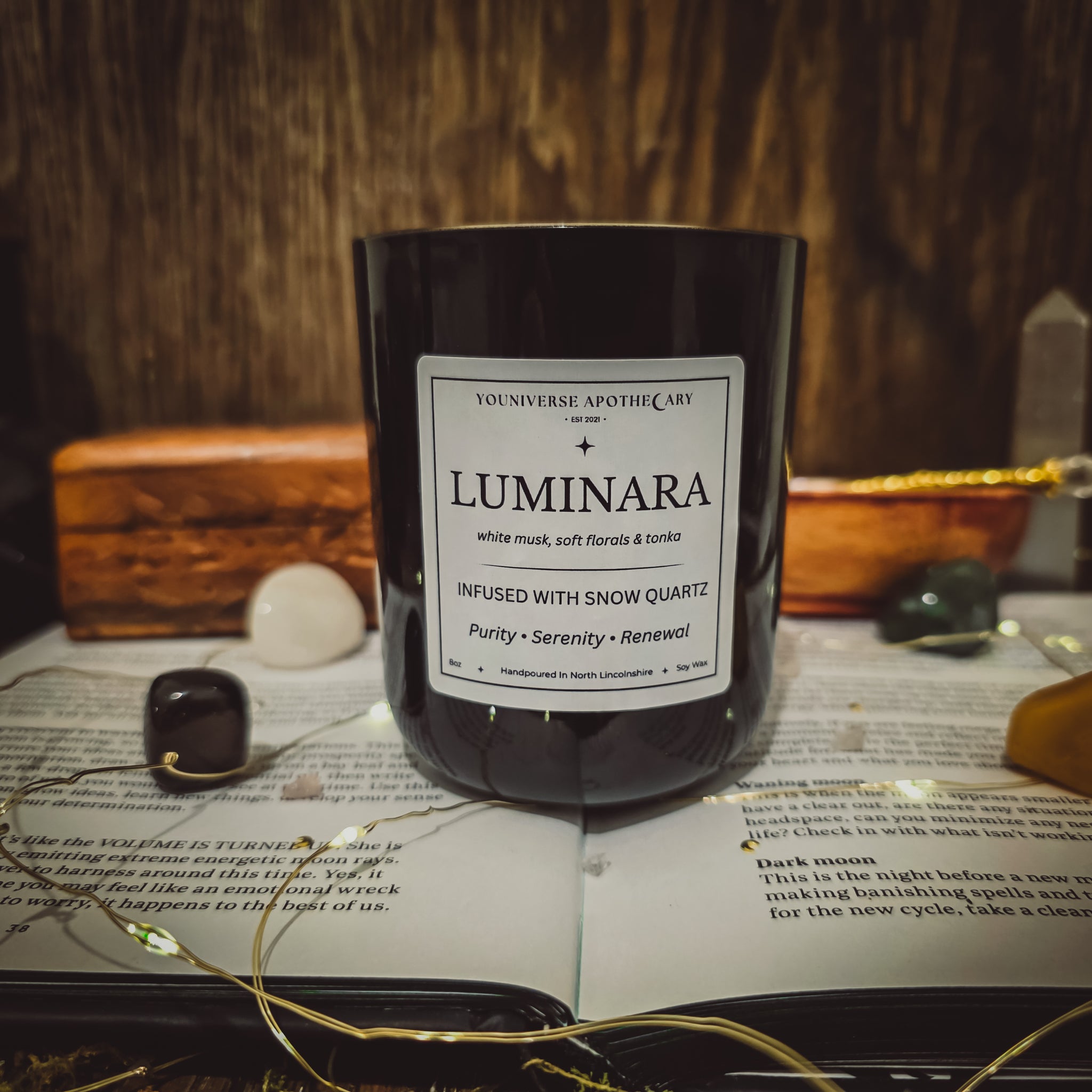 Luminara carries the light-clearing energy of snow quartz - a crystal associated with cleansing stagnant energy, refreshing the energetic field, & restoring clarity & calm. It supports mental freshness, gentle focus, & a sense of lightness, creating space for renewal & reset. The soft musks and pale florals enhance a feeling of quiet radiance, while tonka adds a smooth grounding warmth that keeps the energy balanced & stable.